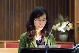 At the podium giving your speech in your cute green vest.